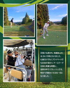 当社にはゴルフ好きなメンバーが多く、休日にはこうして一緒にコースへ出かけて楽しんでいます。自然の中で体を動かすことで、心も体もリフレッシュ。 仕事とはまた違った表情で、笑顔がたくさん溢れる時間になりました。